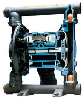 氣動雙隔膜泵采用壓縮空氣、氮?dú)饣蛱烊粴庾鳛閯恿ΑV鞫ㄏ颍鈩樱┛刂崎y將壓縮空氣分配至氣體腔室,向隔膜的內(nèi)表面上施加均勻壓力。同時(shí)排出的氣體從泵另一側(cè)后方通過氣閥組件導(dǎo)向端口排出。